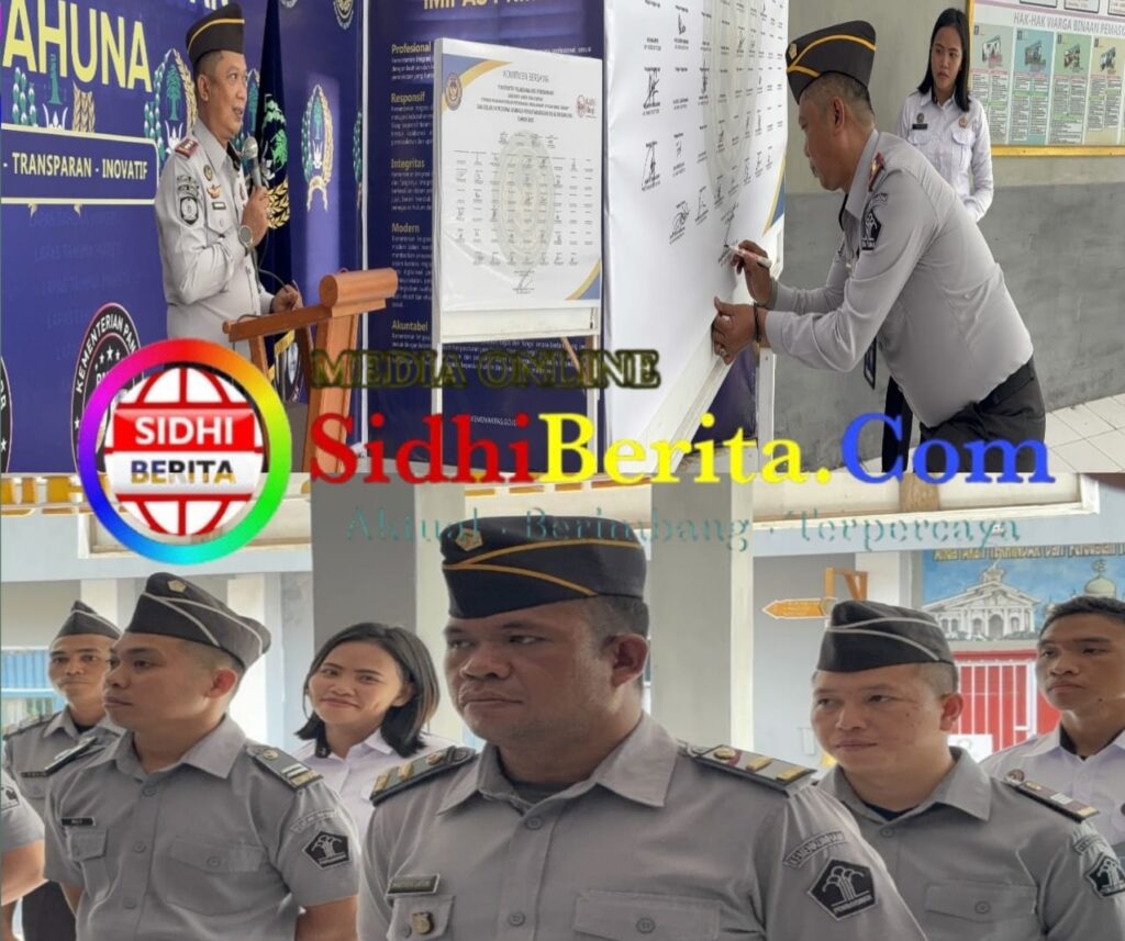 Kegiatan penandatanganan komitmen ini digelar pada pukul 09.00 WITA di Aula Lapas Tahuna, diikuti oleh seluruh pejabat struktural, staf administrasi, serta petugas regu jaga. Acara berlangsung khidmat dalam format upacara resmi yang dipimpin langsung oleh Kalapas Kelas IIB Tahuna, Iskandar Djamil.
